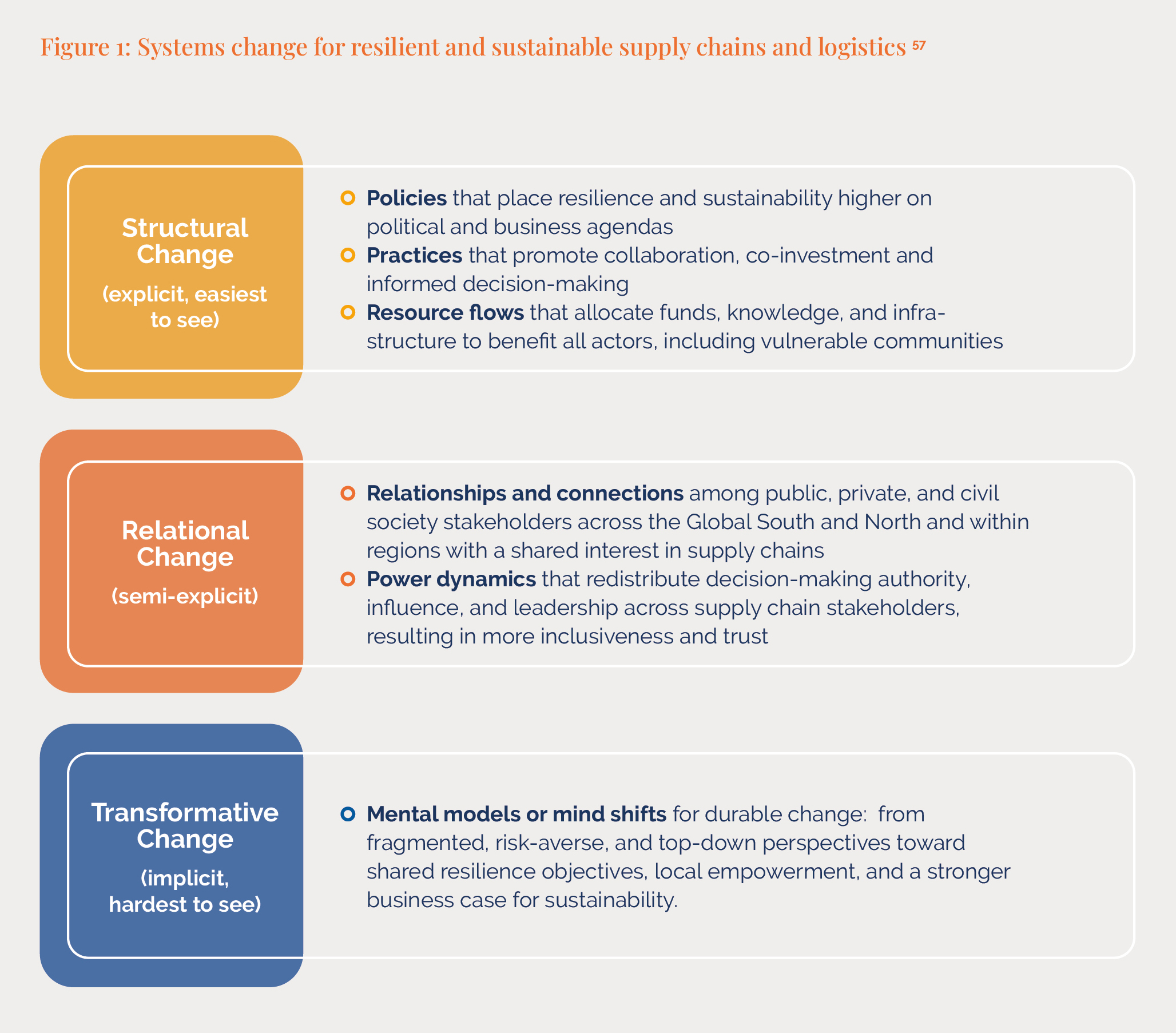 Ultimately, Life-Links aims to help bring about a systems change in supply chains and logistics, which requires working across multiple layers. In practice this means more than new policies or technical measures. To create resilient supply chains that last, we also need to rebalance power, nurture collaboration, and reshape the way people understand the problem itself. This is summarized in Figure 1, and with further details in Part D-4.57