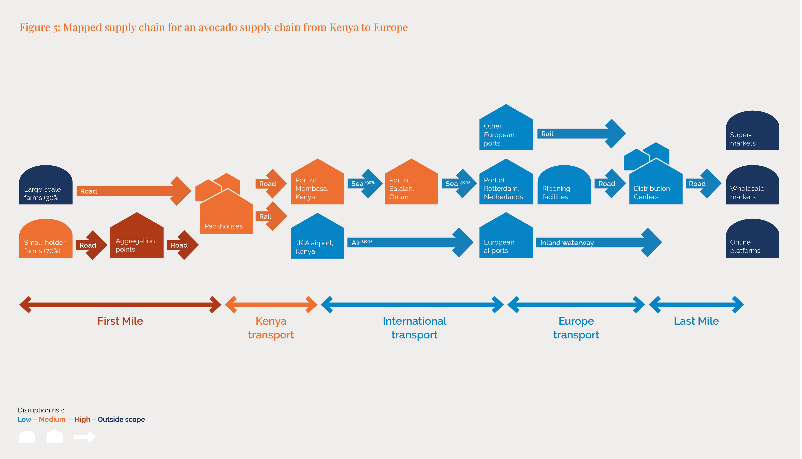 Where possible, use supply chain management tools to produce detailed maps. A practical, less resource-intensive approach is to begin with a simplified map and develop details only for the critical transport link selected later, for example, for an avocado supply chain as shown below. It is also useful to define segments as first mile, middle mile (potentially multiple in global supply chains), and last mile. Apply color-coding to qualitatively indicate disruption risk as low, medium or high.