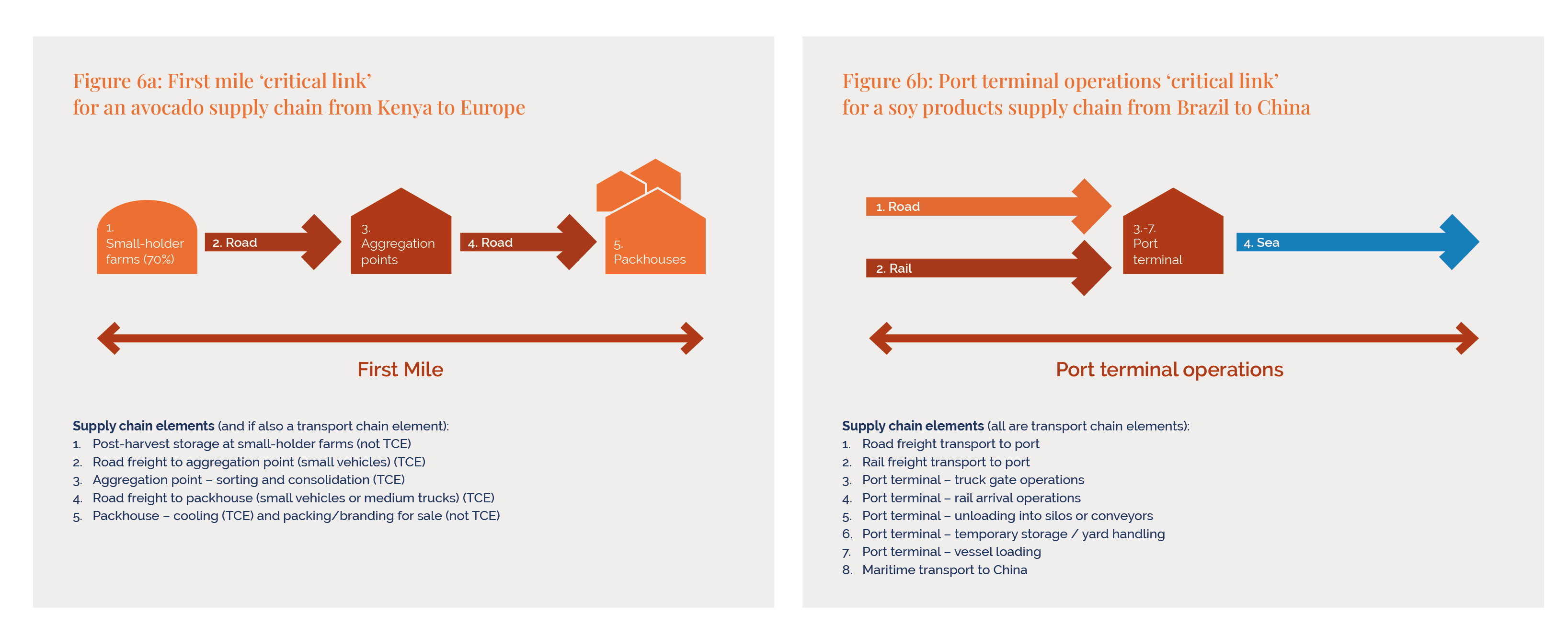 • Existing logistics vulnerabilities. For example, the first mile of Kenya’s avocado supply chain from smallholder farms to packhouses is a critical link because losses can reach 40% mainly due to logistics issues (storage, transport, packing). Rural areas often drive production, but weak logistics – marked by poor roads, aging fleets, informality, and weak regulation – lead to high transport costs, spoilage, losses, and food shortages. From a development perspective, the first mile is also a critical link because smallholder farmers, first-mile transporters (often informal or “popular” transport 144), cooperatives and their communities are the ones whose livelihoods are most affected by disruptions. Reducing food losses here also cuts a hidden source of GHG emissions in agriculture.