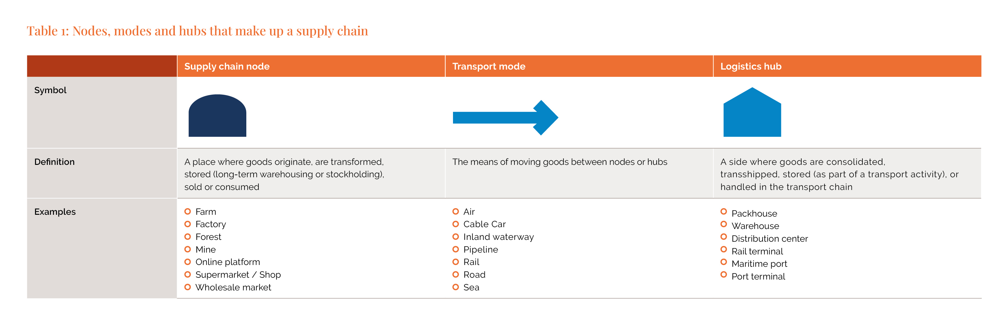 Table 1: Nodes, modes and hubs that make up a supply chain