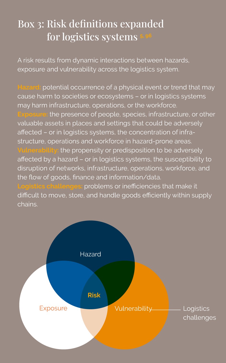Risks result from the interaction between hazards, exposure and vulnerability (see Box 3). An assessment of risks and impacts of supply chain disruptions can be carried out in different ways, from qualitative to quantitative, and at varying levels of depth. The choice depends on the time, resources, and data available, which will naturally differ from one application to another.