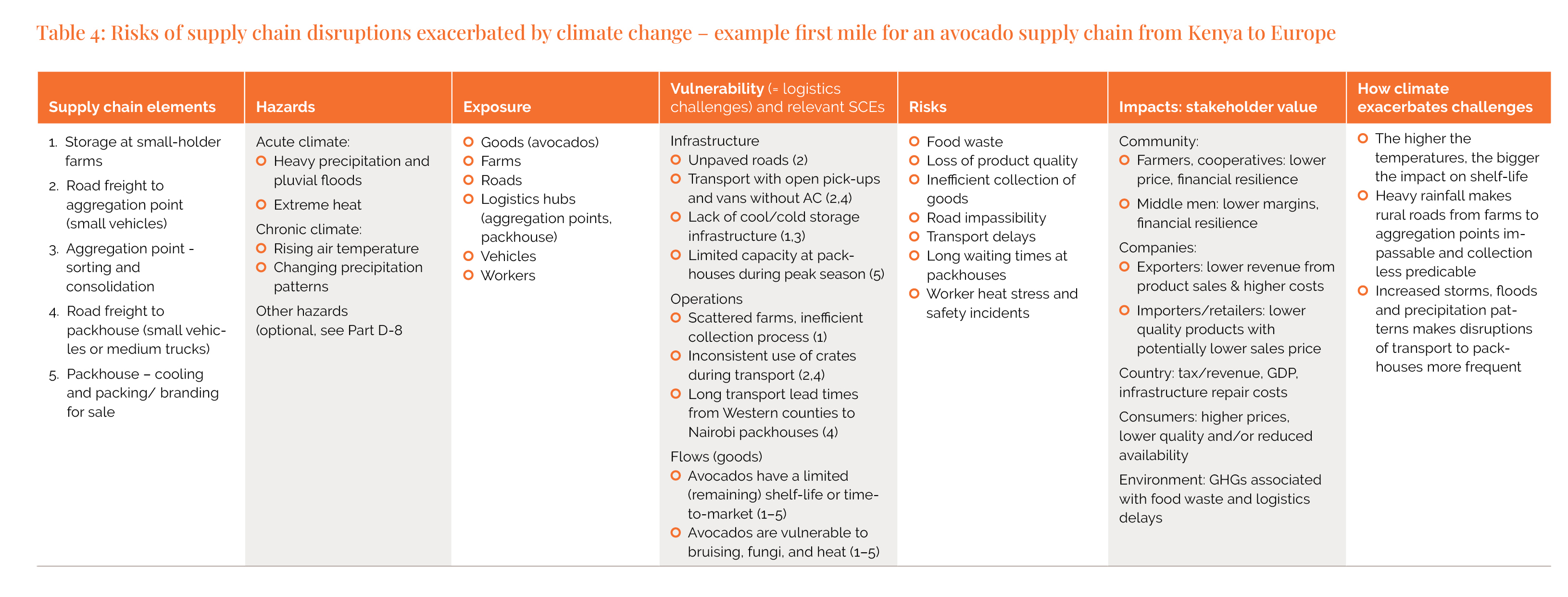 Focusing on logistics challenges makes vulnerabilities more tangible and enables an easier connection to risks and impacts that stakeholders can clearly recognize. It also helps them understand how climate change may exacerbate existing challenges. This is illustrated with the avocado application in Table 4.