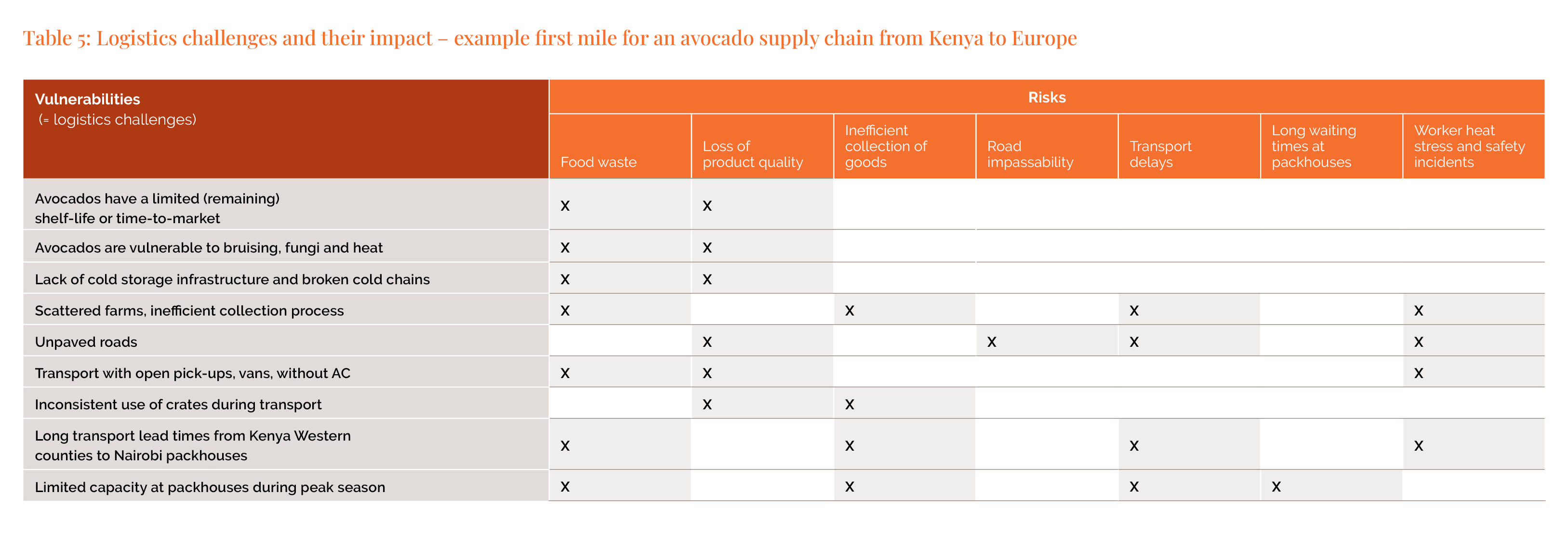 Next, determine how these logistics challenges can lead to risks of disruption. For example, as shown in Table 5, unpaved roads are more susceptible to heavy rain and flooding, which can make roads impassable or delay transportation. Inconsistent use of crates may lead to bruising of avocados transported in open pick-up trucks along these roads. Since logistics challenges often connect to multiple risks, use a matrix to record and analyse these relationships.