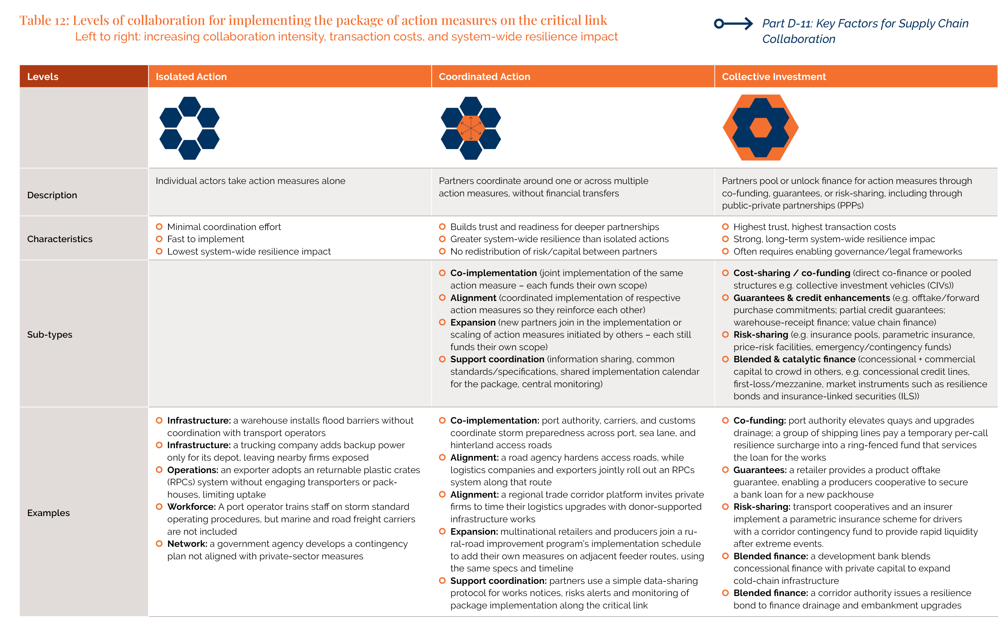 - Multiple links or corridor: at a larger scale, coordinated action on a transport corridor or port can deliver similar shared value. For example, a public–private partnership to upgrade a rail link or strengthen a port against flooding requires public investment but also depends on private actors. Governments or road/rail agencies may finance and build the infrastructure, while shippers commit to routing volumes through the improved link, LSPs coordinate services, and insurers help de-risk the investment. Without this alignment, new infrastructure risks being under-used or failing to deliver resilience benefits. With it, however, both public and private actors can secure more reliable trade flows and lower disruption risks.